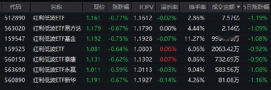 1月8日,创业板指盘中跌超1%,沪指跌0.07%录得K线15连阳。在此背景下,红利低波ETF(512890)跌0.77%,报1.161元,换手率2.86%,成交额7.57亿元,居同类标的ETF首位。
