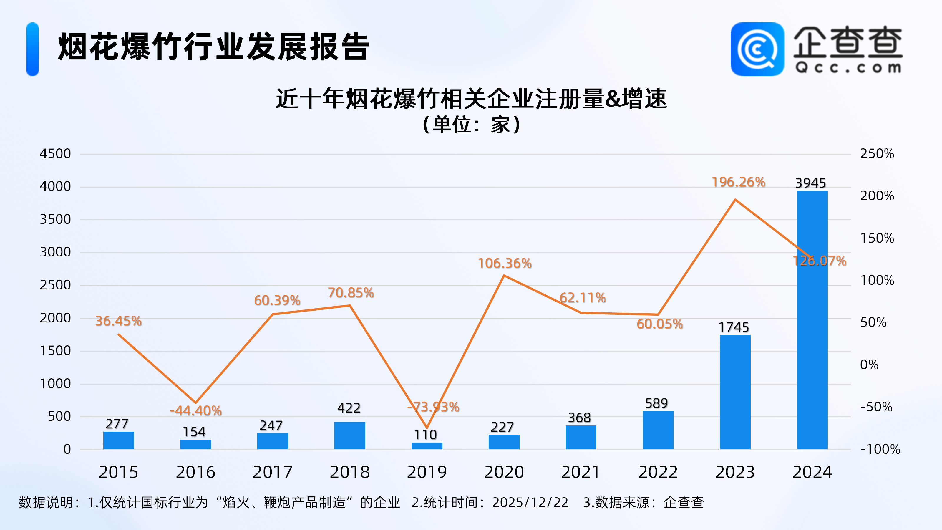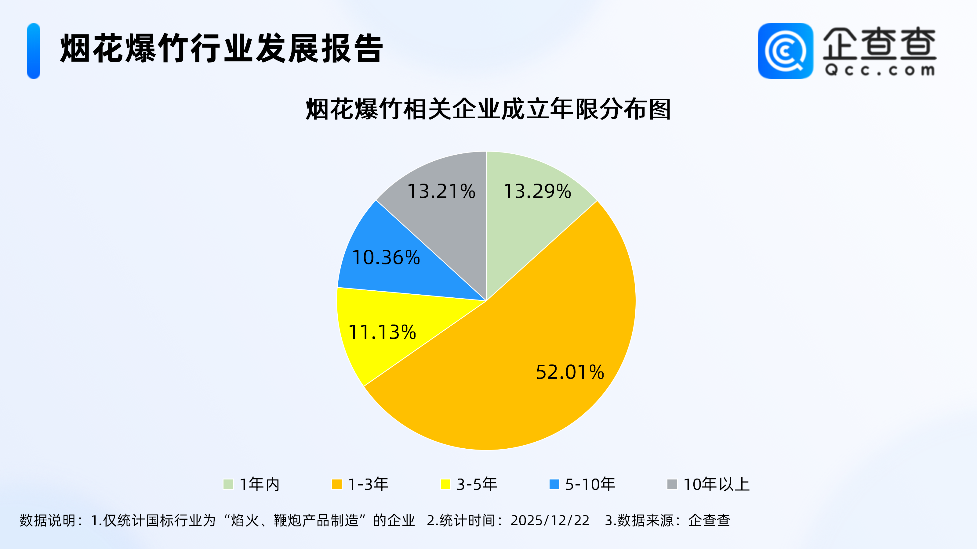 据澎湃新闻报道,12月16日,山西省发布了《关于宣布废止124件行政规范性文件的决定》,其中包括《山西省人民政府关于禁止生产、经营、储存、运输和燃放烟花爆竹的通告》,表示该《通告》自12月16日起停止执行,不再作为行政管理依据。此举意味着山西省烟花爆竹管理从全面禁放模式,正式转为科学限放管理模式。中国烟花爆竹协会表示,烟花爆竹是我国传统优秀文化的重要载体,山西省通过明确限放时段、区域及安全管理要求,既能保留节日氛围、传承民俗文化,又能有效管控烟花爆竹安全风险。企查查数据显示,截至12月22日,国内现存烟花爆竹相关企业7141家。注册量方面。近十年相关企业注册量呈整体增长态势,其中2023年、2024年烟花爆竹相关企业注册量分别同比快速增长196.26%、126.07%至1745家、3945家。截至目前,今年已注册2365家烟花爆竹相关企业。存量方面,从经营时间来看,成立年限在1-3年的烟花爆竹相关企业占比过半,达52.01%。从地区分布来看,相关企业经营分布涉及700多个县级行政区,其中分布在“四大花炮之乡”的烟花爆竹相关企业合计占比达14.62%。1.今年已注册2365家烟花爆竹相关企业