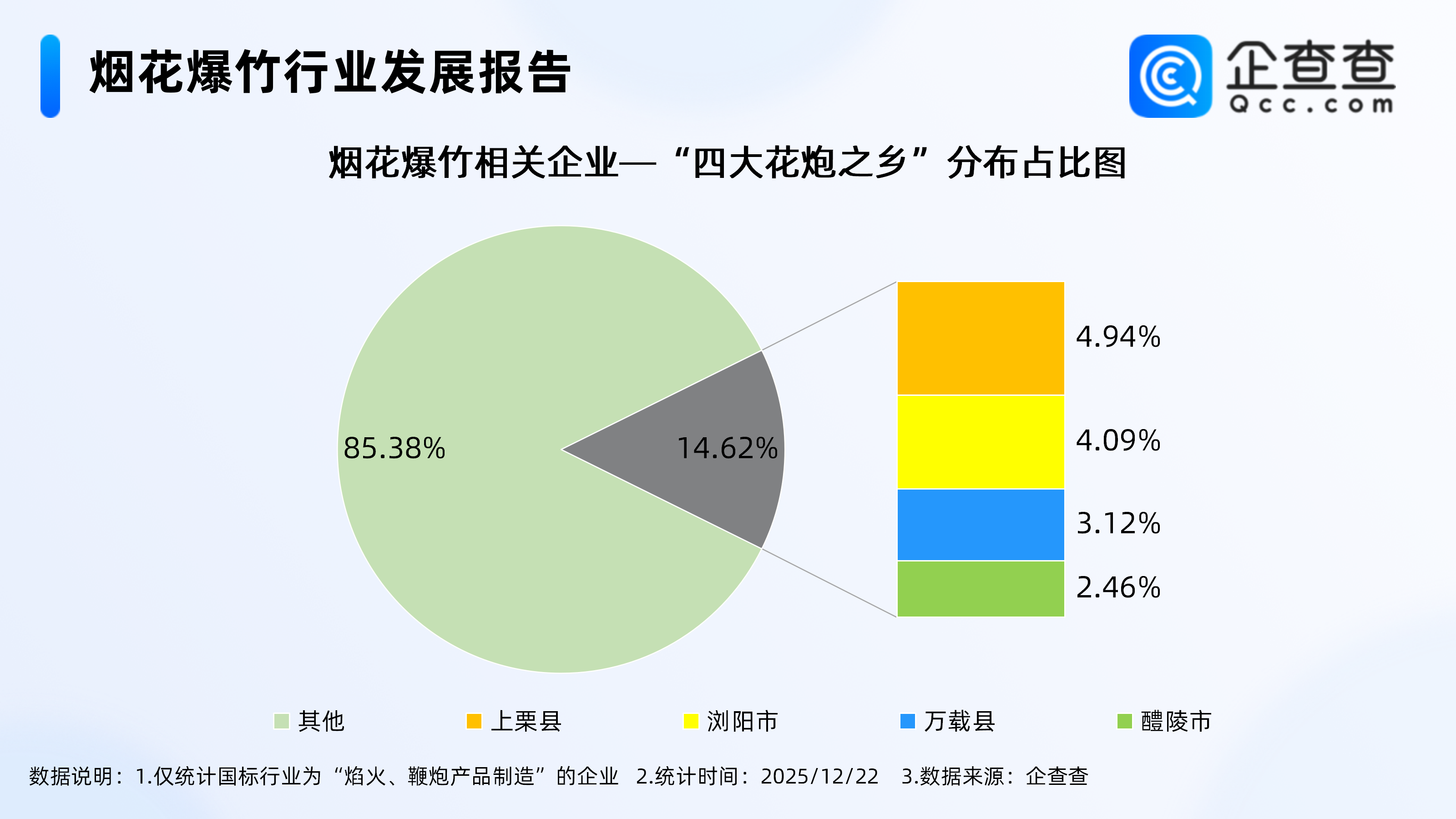 企查查数据显示,烟花爆竹作为传统的民俗符号深入千家万户,相关企业经营分布涉及国内700多个县级行政区,其中分布在“四大花炮之乡”——“中国烟花之乡”浏阳市、“中国烟花爆竹之乡”上栗县、“花炮之乡”万载县、“中国花炮之都”醴陵市的烟花爆竹相关企业合计占比达14.62%,分别占比为4.94%、4.09%、3.12%、2.46%。